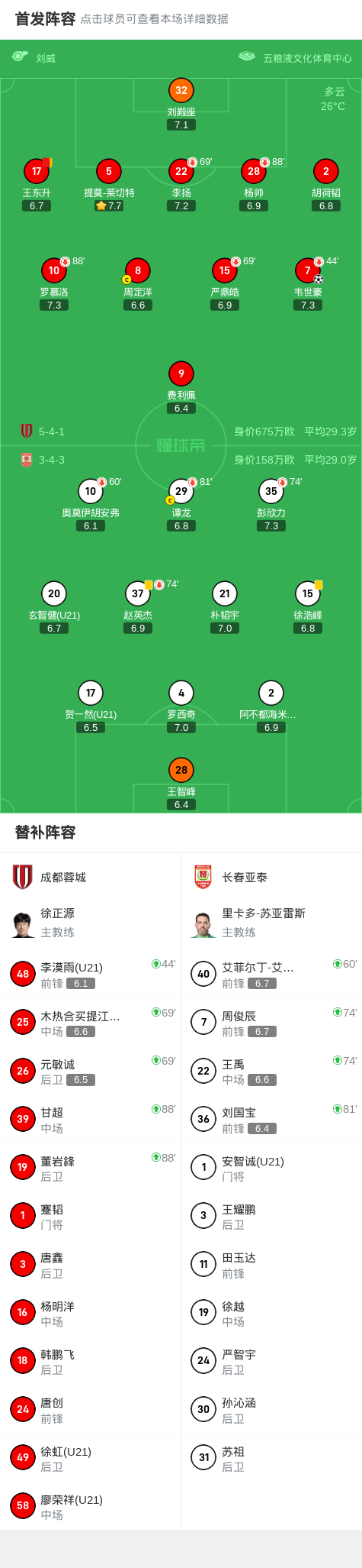 北京时间9月12日19:35,中超第24轮展开争夺,成都蓉城坐镇主场五粮液文化体育中心专业足球场迎战长春亚泰,本场主裁判为刘威,VAR裁判为刘钊。上半场,韦世豪任意球直接破门闪击后在第44分钟伤退。下半场,成都屡失良机,王东升累计两黄被罚下。最终,成都主场1-0小胜亚泰,联赛继续领跑。